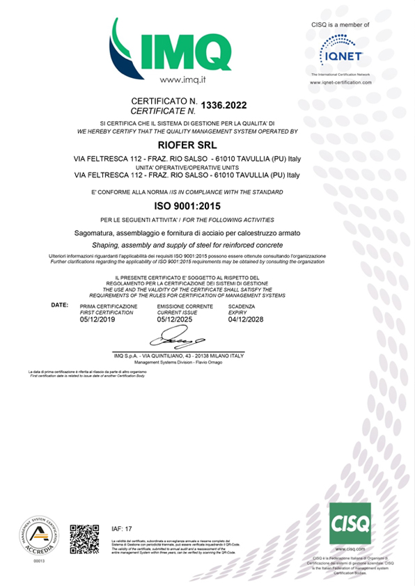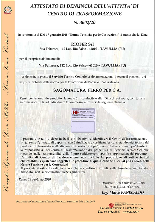 La RIOFER S.r.l. è certificata UNI EN ISO 9001:2015 per sagomatura, assemblaggio e fornitura di acciaio per calcestruzzo armatoed è riconosciuta mediante l'attestato di denuncia dell'attività "CENTRO DI TRASFORMAZIONE N°3602/20" in conformità al D.M. 17 Gennaio 2018 "Norme tecniche per le costruzioni".