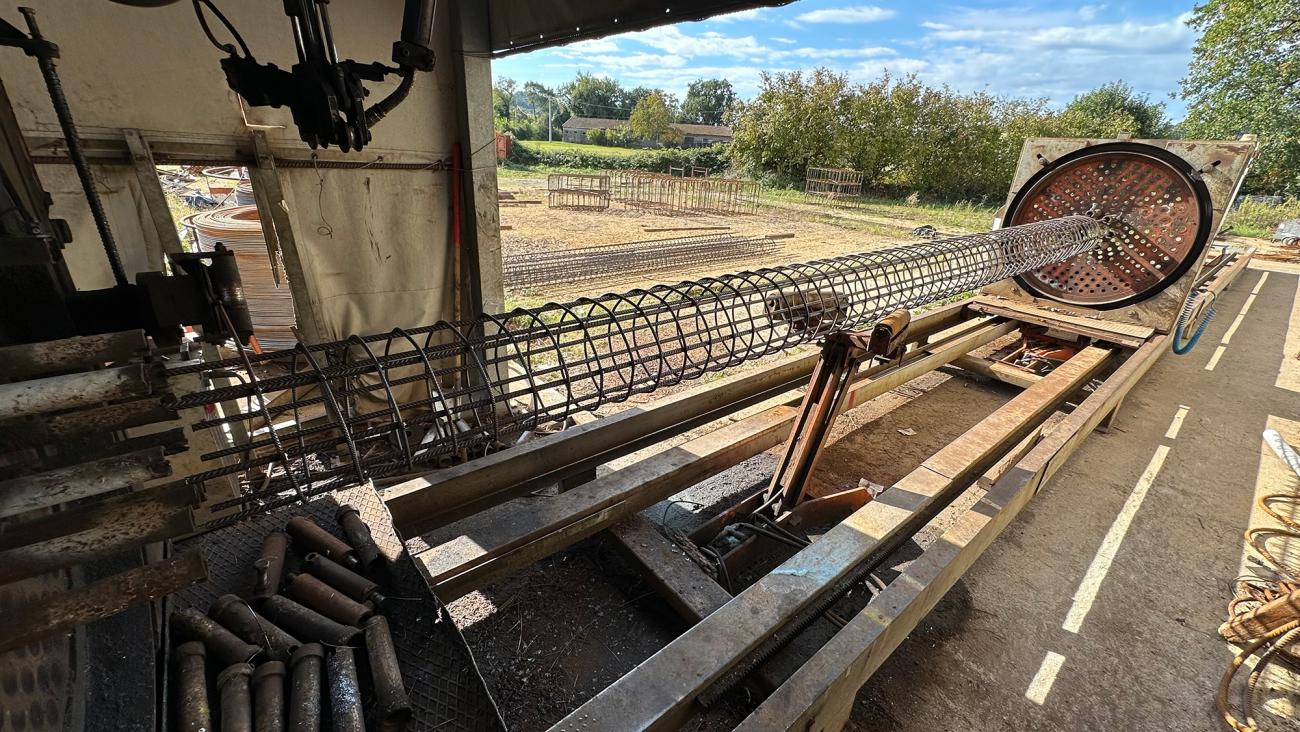 Gabbiatrice per la formazione di pali cilindrici con spirale saldata e passo programmabile; massima gabbia realizzabile: Ø 1100 mm.
